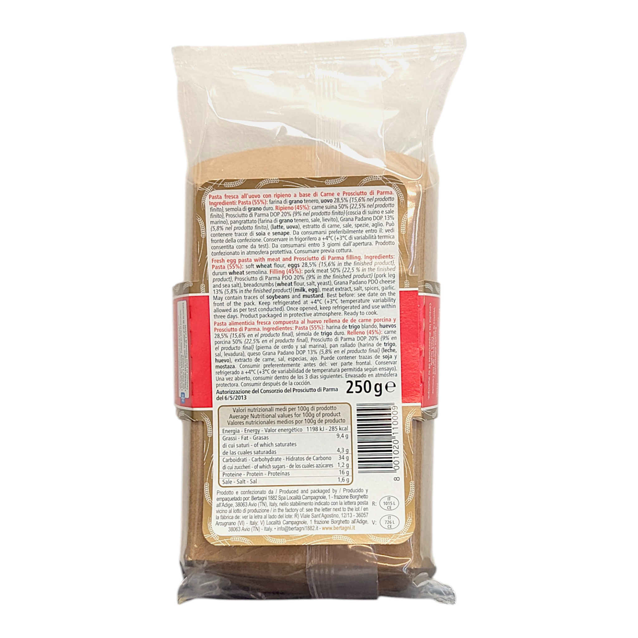 Filling (45%): pork meat, Prosciutto di Parma PDO, breadcrumbs (WHEAT flour), Grana Padano PDO (MILK, EGG), meat extract, salt, spices, garlic.
