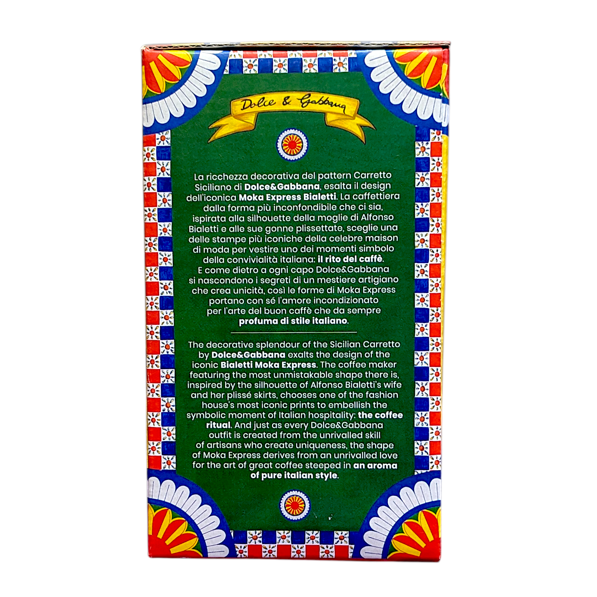 Dolce&Gabbana brings the spirit of Sicily to global fashion through bold colours, heritage motifs, and artisanal detail. This collaboration with Bialetti merges iconic Italian coffee tradition with high fashion creativity, celebrating culture, craftsmanship, and unmistakable Italian style.