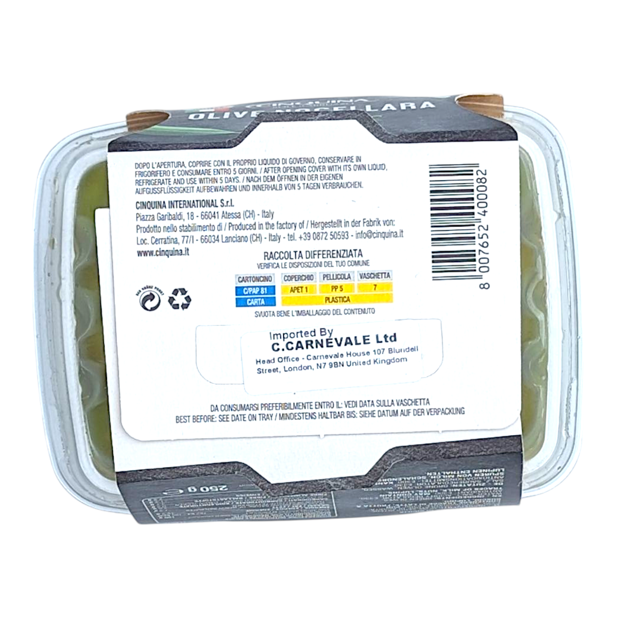 Cinquina is a proud ambassador of Italy’s olive-growing excellence, offering a curated selection of preserved olives and antipasti with deep roots in the Abruzzo region. Their Nocellaria olives pay homage to Sicily’s most iconic variety—celebrated for its balanced flavour, natural richness, and versatility.
