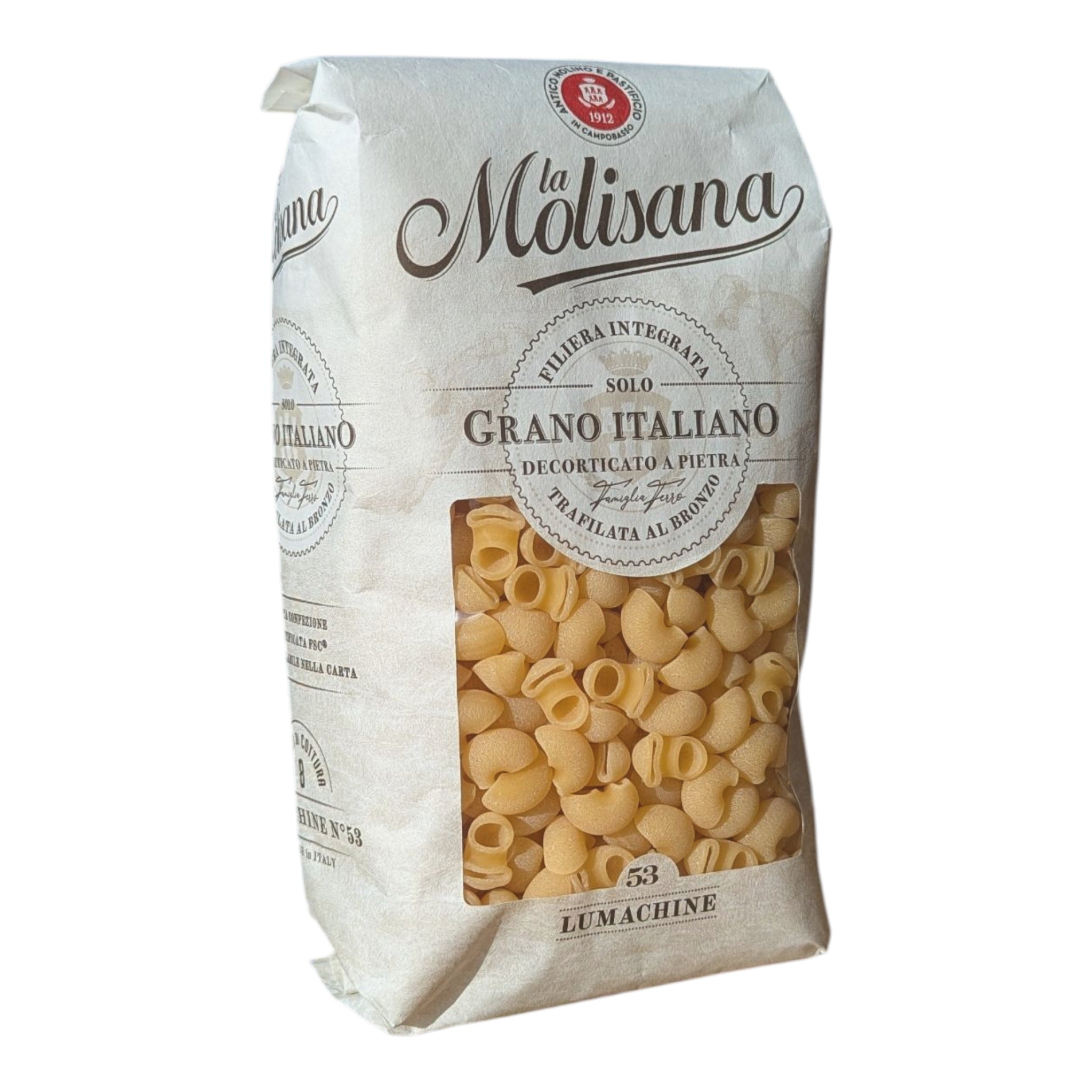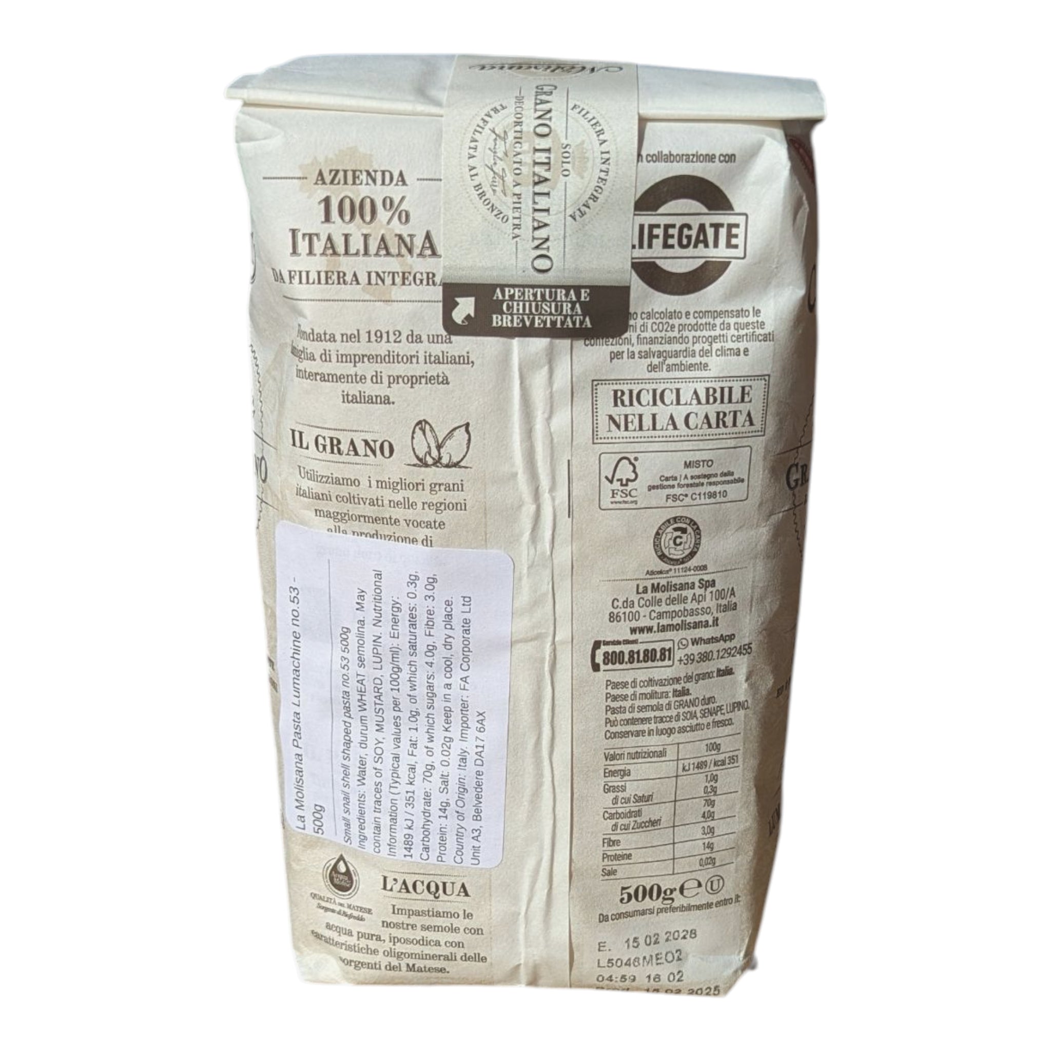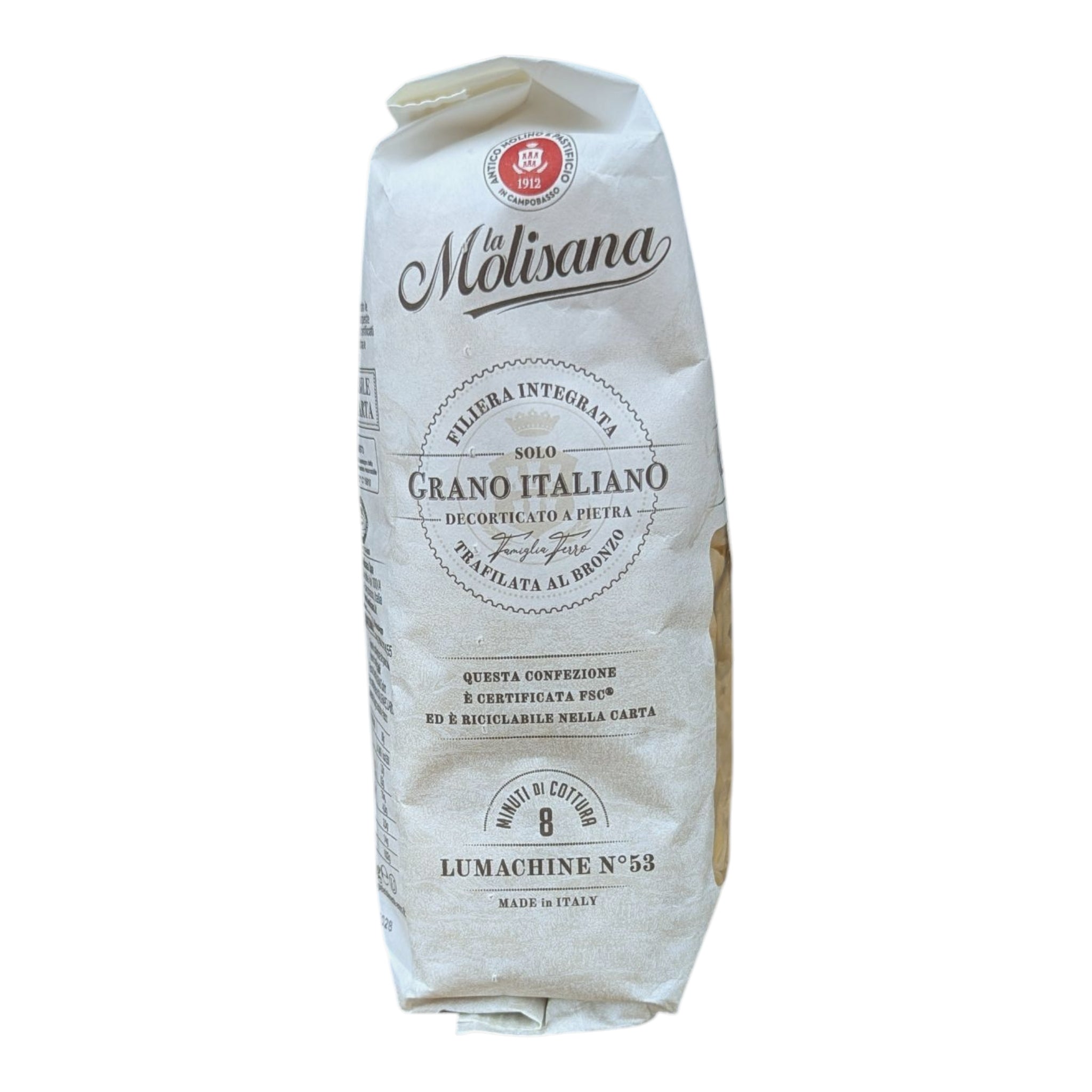La Molisana’s Lumachine No.53 is a charming small pasta shape inspired by snail shells, perfect for capturing sauces, peas, or small diced vegetables in every bite. Its compact form and ridged exterior make it a go-to choice for soups, oven bakes, and creamy pasta dishes that need a comforting touch.