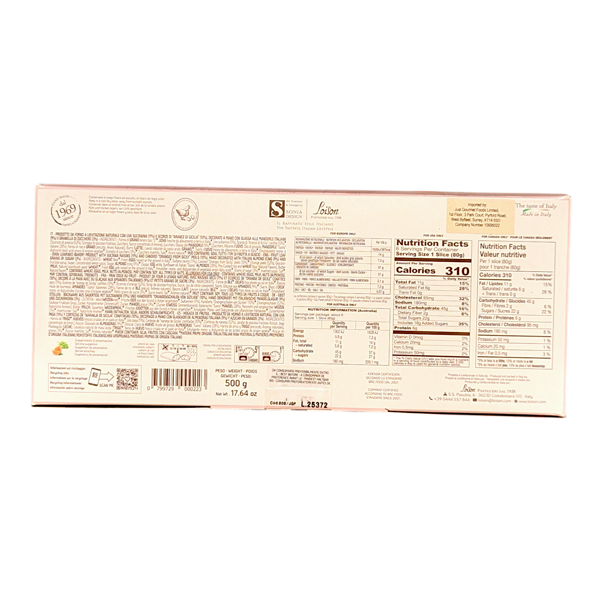 Loison Filone Frutta is a traditional Italian loaf cake enriched with sultana raisins, candied Sicilian orange peel, and topped with almond icing and sugar crystals. Slowly leavened with natural sourdough, it offers a delicate crumb and fragrant sweetness that evokes the warmth of home-baked Italian desserts.