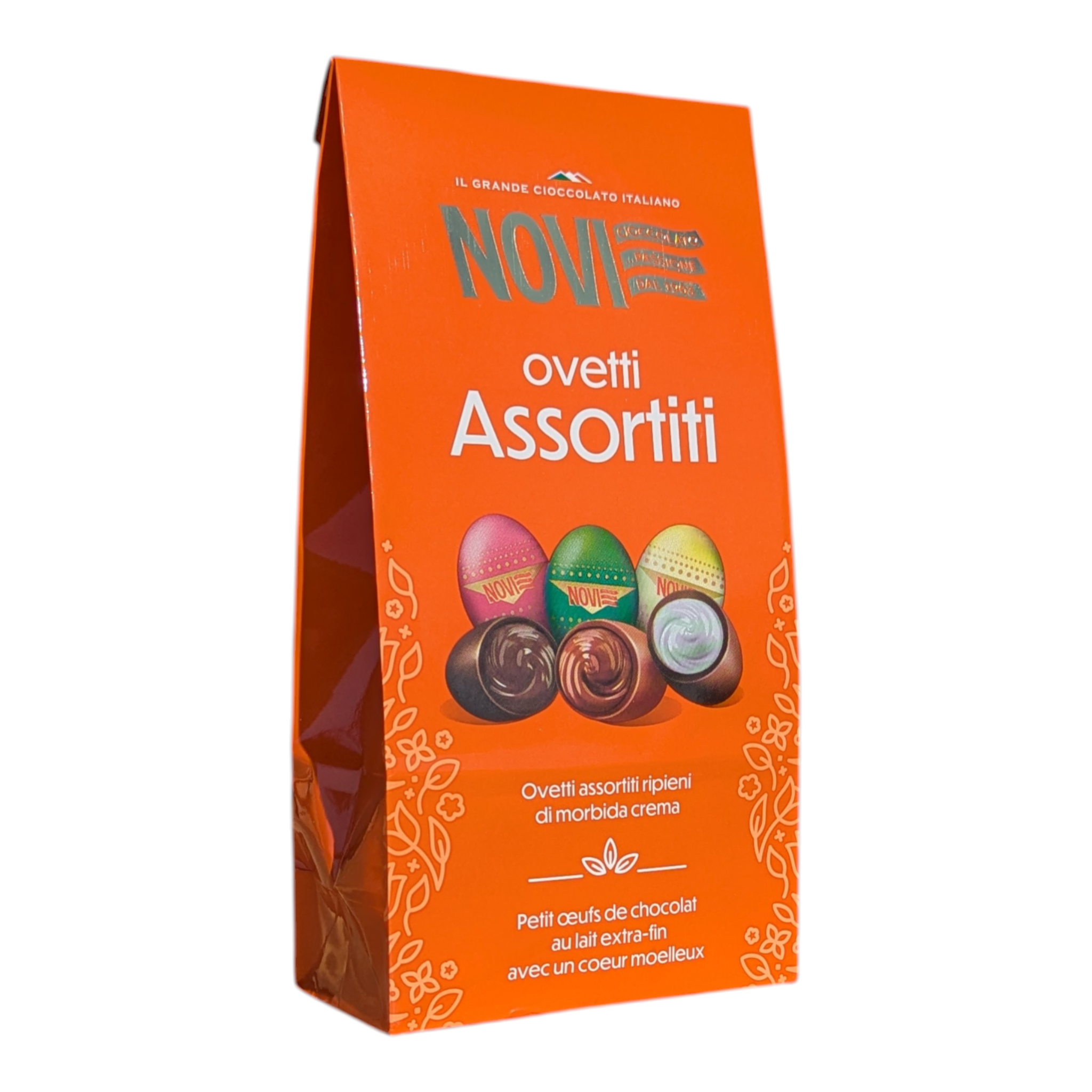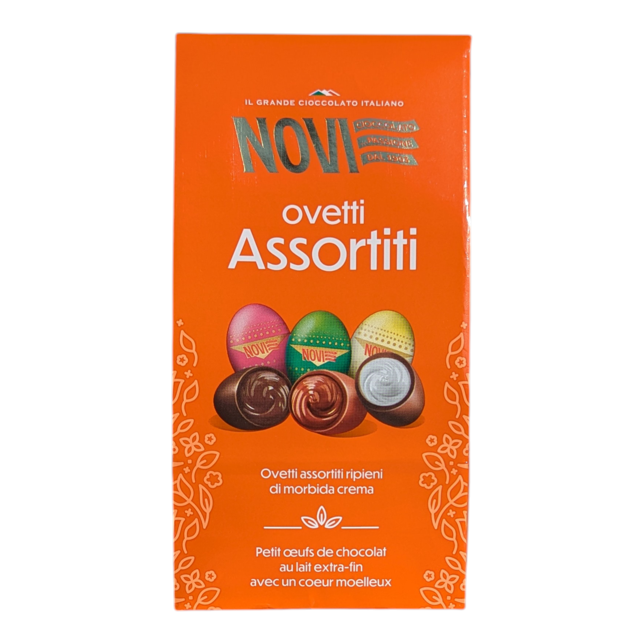 Novi Ovetti Assortiti are small, individually wrapped chocolate eggs filled with smooth, creamy centres. Made with extra fine milk chocolate, they have a rich cocoa flavour that melts easily and delivers that classic Italian chocolate taste.
