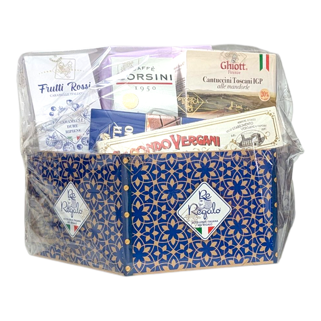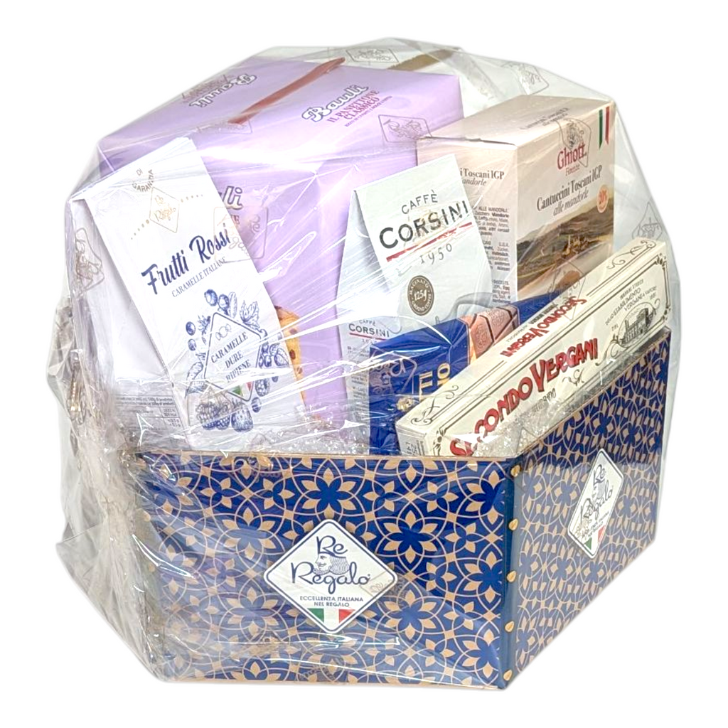 The collection continues with Tuscan cantuccini for a satisfying crunch, Vergani soft nougat that melts with honeyed sweetness, and delicate Virginia Canestrelli biscuits. The kind of treat you’d find in an elegant Italian pasticceria. A touch of nostalgia comes from the I.N.C.A.P. Red Fruits Candies, while a packet of Corsini ground coffee completes the experience with an authentic Italian aroma that lingers long after the last bite.