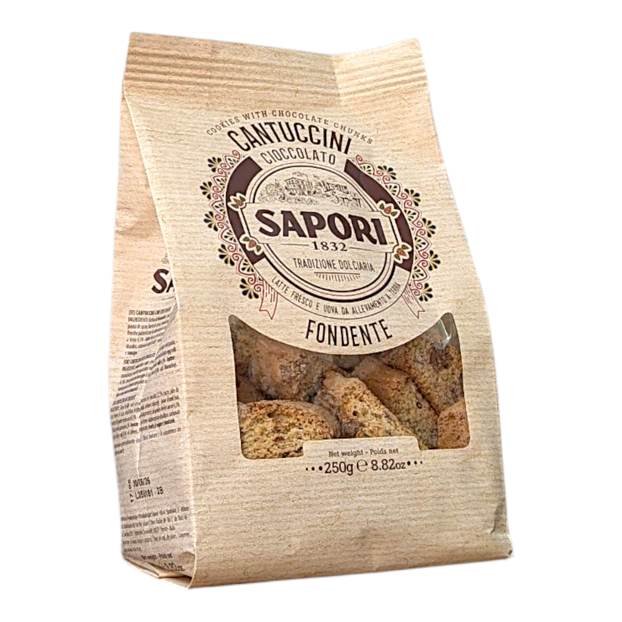Sapori Cantuccini Fondente are classic Tuscan biscotti made with crunchy almonds replaced by rich dark chocolate drops and chunks. Twice baked for their traditional crisp texture, these cantuccini pair beautifully with coffee, cappuccino, or dessert wine such as Vin Santo.