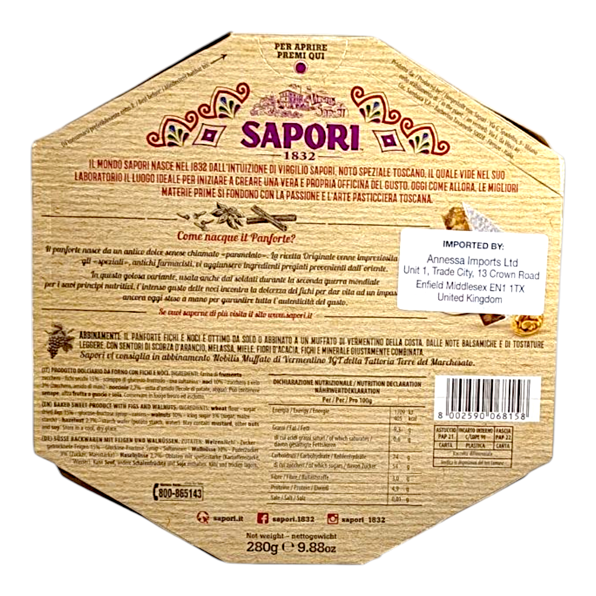 Sapori, founded in Siena in 1832, is synonymous with the art of Italian pastry-making. Their Panforte range brings the essence of Tuscany to the world. From soft almond versions to rich chocolate and fig variations. All made with care, passion, and premium ingredients. A festive favourite, enjoyed across Italy for nearly two centuries.